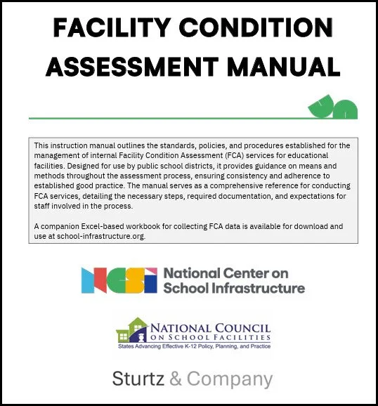 This Facility Condition Assessment Manual outlines the standards, policies, and procedures established for the management of internal Facility Condition Assessment (FCA) services for educational facilities. Designed for use by public school districts, it provides guidance on means and methods throughout the assessment process, ensuring consistency and adherence to established good practice. The manual serves as a comprehensive reference for conducting FCA services, detailing the necessary steps, required documentation, and expectations for staff involved in the process. A companion Excel-based workbook for collecting FCA data is available for download. In an 18-minute video available on the National Center on School Infrastructure's website, David Sturtz of Sturtz & Company describes each tab of the workbook and how to input information.